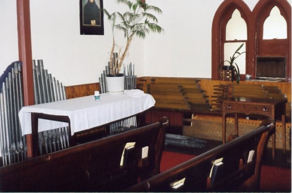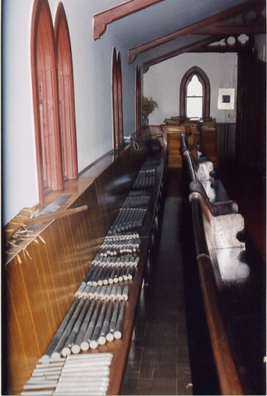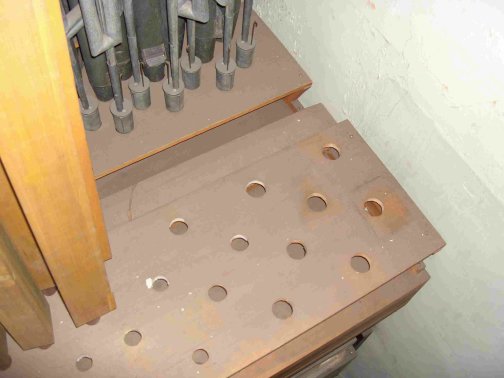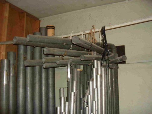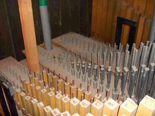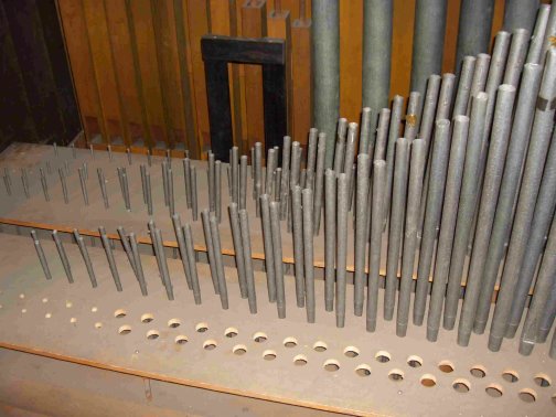 Die ersten Register sind ausgebaut, dahinter sind die im Laufe der Zeit zur Seite gerutschen Pfeifen zu sehen.