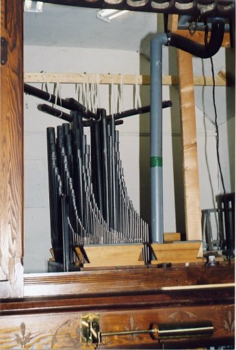 Etwas chaotische Aufhängung der Viola da Gamba Im Hintergrund: das tiefe C des Prinzipal 8' war zu kurz, wurde deshalb mit Pappe verlängert.